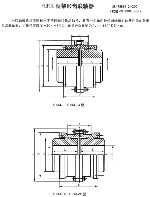 4. 鼓形齒聯軸器軸孔型式采用Y、Z1和J1組合,滿足多種軸孔連接需要。 鼓形齒聯軸器產品包括GICL、GⅡCL,GICLZ,GⅡCLZ和NGCL五種型式鼓形齒聯軸器