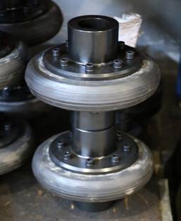 裝配時用螺栓與兩半聯軸器的凸緣連接,依靠擰緊螺栓使輪胎與凸緣端面之間產生的摩擦力來傳遞轉矩,輪胎環工作時發生扭轉剪切變形,故輪胎聯軸器具有很高的彈性,補償兩軸相對位移的能力較大,并有良好的阻尼,而且結構簡單、不需潤滑、裝拆和維護都比較方便。其缺點是承載能力不高、外形尺寸較大,隨著兩軸相對扭轉角的增加使輪胎外形扭歪,軸向尺寸略有減小,將在兩軸上產生較大的附加軸向力,使軸承負載加大而降低壽命。輪胎聯軸器高速運轉時,輪胎外緣離心力的作用而向外擴張,將進一步增大附加軸向力。為此,在安裝輪胎聯軸器時應采取措施,使輪胎中的應力方向與工作時產生的應力方向相反,以抵消部分附加軸向力,達到改善聯軸器和兩軸承的工和條件