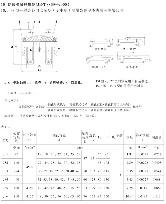 蛇形彈簧聯(lián)軸器,是一種結(jié)構(gòu)*的金屬?gòu)椥月?lián)軸器,它靠蛇形彈簧片來(lái)傳遞扭矩,蛇形彈簧聯(lián)軸器是當(dāng)今國(guó)際機(jī)械領(lǐng)**的軸聯(lián)接傳動(dòng)部件,也是一種非常通用的軸聯(lián)接傳動(dòng)部件蛇形彈簧聯(lián)軸器共有九類(lèi)型式,分別是JS罩殼徑向安裝型(基本型)蛇形彈簧聯(lián)軸器、JSB罩殼軸向安裝型蛇形彈簧聯(lián)軸器、JSS雙法蘭聯(lián)接型蛇形彈簧聯(lián)軸器、JSD單法蘭聯(lián)接型蛇形彈簧聯(lián)軸器、SJS接中間軸型蛇形彈簧聯(lián)軸器、JSG高速型蛇形彈簧聯(lián)軸器、JSZ帶制動(dòng)輪型蛇形彈簧聯(lián)軸器、JSP帶制動(dòng)盤(pán)型蛇形彈簧聯(lián)軸器、JSA安全型蛇形彈簧聯(lián)軸器等。